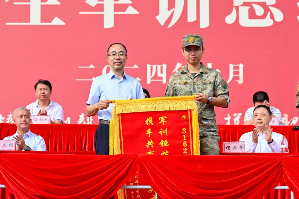 分列式汇演后,学生处处长李浩泉宣读了表彰决定,学校领导为获奖先进集体和先进个人颁奖。学校党委副书记、校长贺定修向承训部队赠送锦旗。