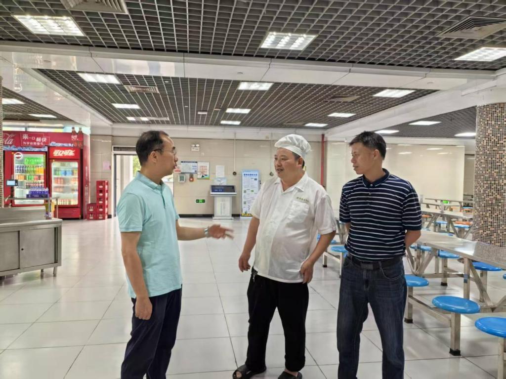 随后,贺定修校长来到学校食堂,实地查看食品加工操作间、冷藏冷冻设备、餐具消毒间及仓库管理情况。贺校长详细询问了食材采购验收、食材留样、餐具消杀及从业人员健康管理等关键环节的落实情况,并对食堂后厨的环境卫生和食材存储规范性提出要求。