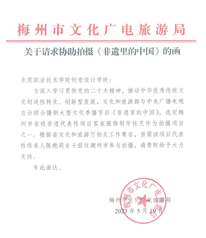 近日,根据省文化和旅游厅相关工作要求,我校服装与服饰设计专业教师陈桃莉作为广东省非物质文化遗产项目《中式服装制作技艺——客家服饰制作技艺》的传承人,受梅州市文化广电旅游局邀请参加中央广播电视台《非遗里的中国·广东篇》节目录制。陈桃莉老师在本次拍摄工作中携客家传统服饰出镜,负责服饰搭配、妆发造型指导等相关工作。